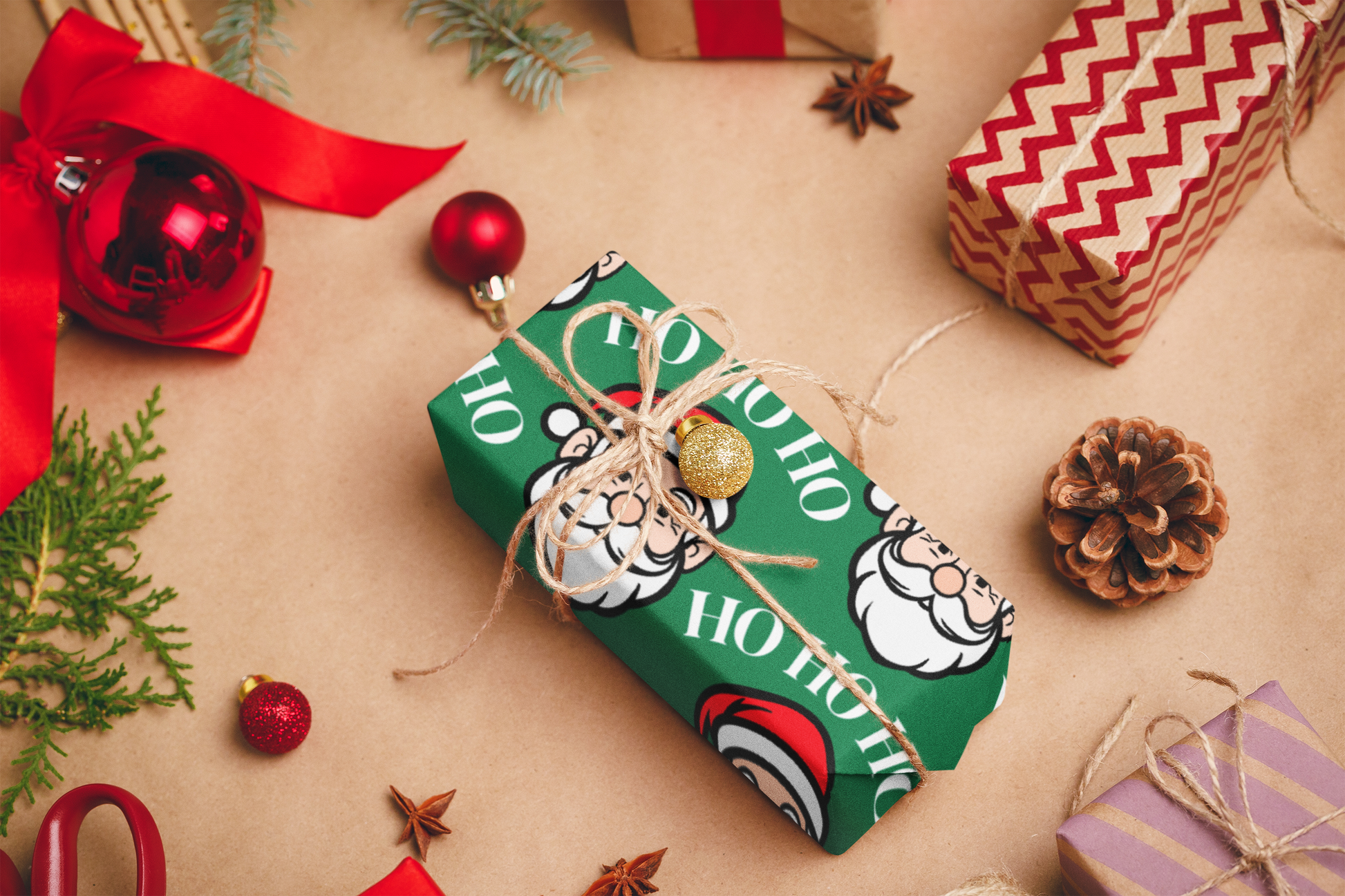 This festive wrapping paper brings playful holiday cheer to every gift. Bright Santa faces and repeating “HO HO HO” typography pop against a deep green background, creating a nostalgic, fun atmosphere that makes unwrapping feel like part of the celebration. Printed single-sided on sturdy 90 gsm fine art paper, you can choose a glossy sheen for vibrant colors or a smooth matte for a refined look. Available in three generous lengths, it wraps small boxes or long parcels with ease. Note: sheets include small white margins at top and bottom with a production bar and QR code.
